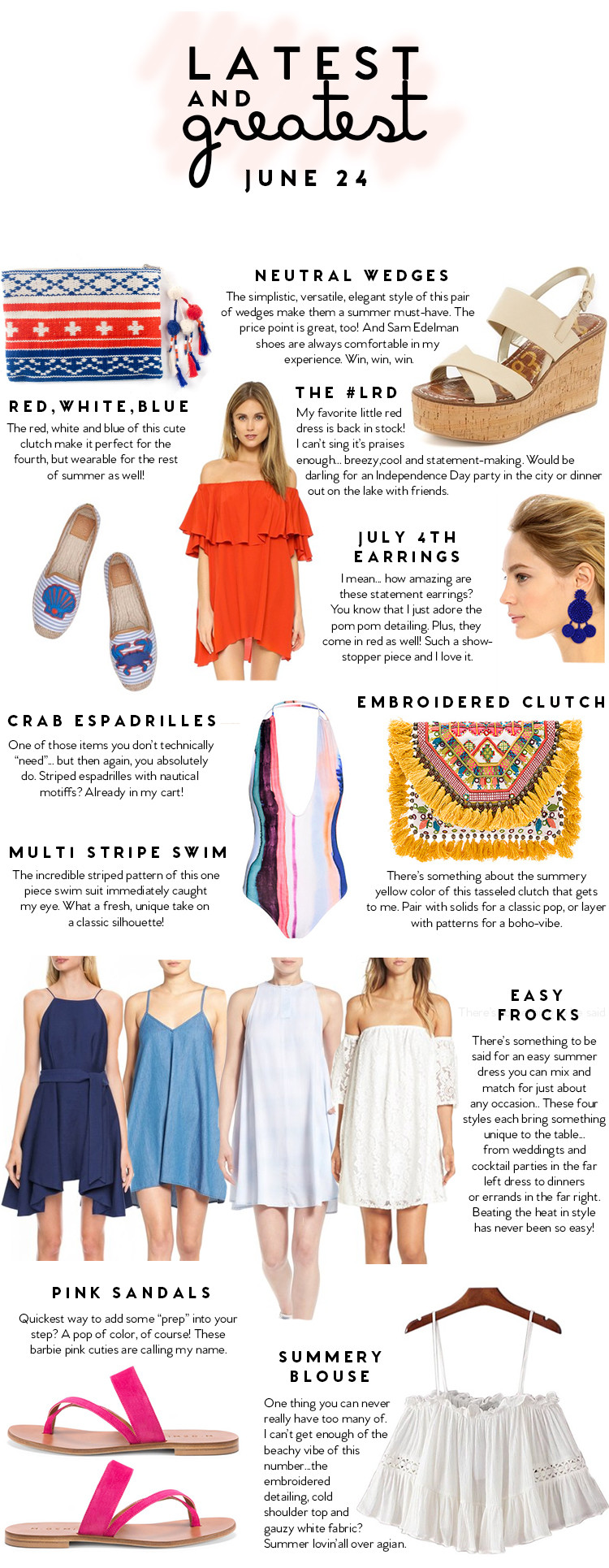 We officially have one weekend left until 4th of July, and in celebration, you’ll find many of the items included in today’s “Latest and Greatest” roundup absolutely befitting of the occasion! Reds, whites and blues that won’t only make a splash for star-spangled soirées, but all throughout the course of the rest of summer as well. My absolute favorite? This red dress, that’s finally back in stock! You saw me wear it last here, and since then it’s been my ultimate summer go-to. I also can’t get my eyes off of these amazing statement earrings! They remind me of an updated, fresh version of this pair which I love as well. Too much fun.